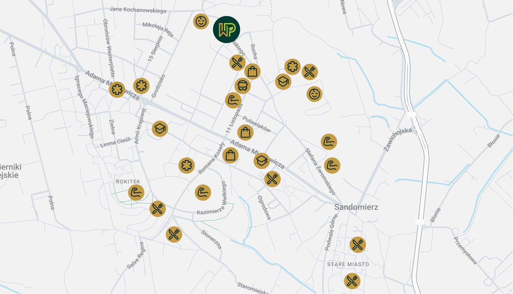 Osoby chcące zadbać o zdrowie mogą skorzystać ze znajdujących się w pobliżu stref fitness, stadionu oraz przychodni medycznych. W odległości niespełna dwóch kilometrów znajduje się zabytkowe Stare Miasto – tętniące życiem centrum Sandomierza.